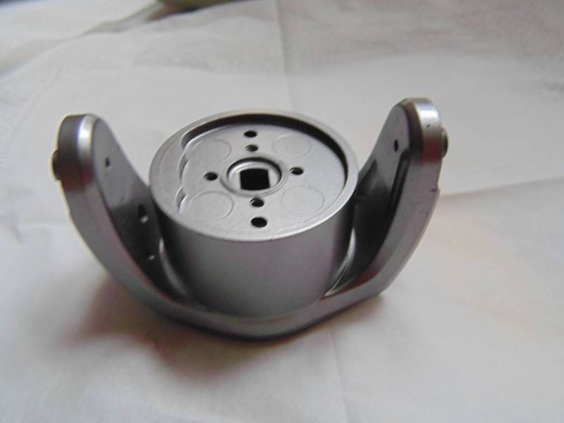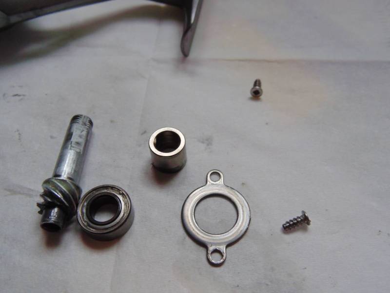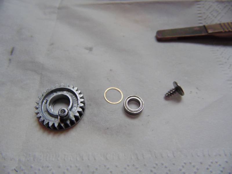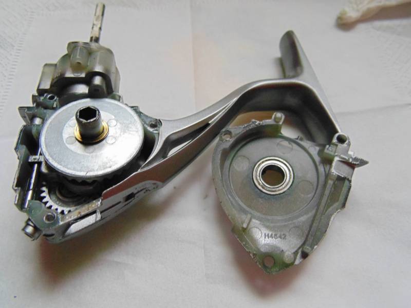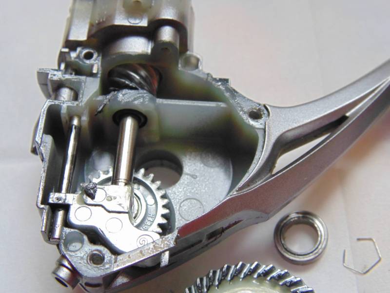 Теперь смотрим что там внутри! Ведущее колесо из неплохого алюминиевого сплава, опирается на два подшипника размером 7*13*4 и 7*11*3. Как я говорил выше с ведомой налажали, она очень хрупкая. Паразитка нормальная, по сути из такого же металла, что и ведущее колесо. Хорошо хоть сверху опиратеся на большой подшипник 7*14*5, снизу фторопластовая втулка.