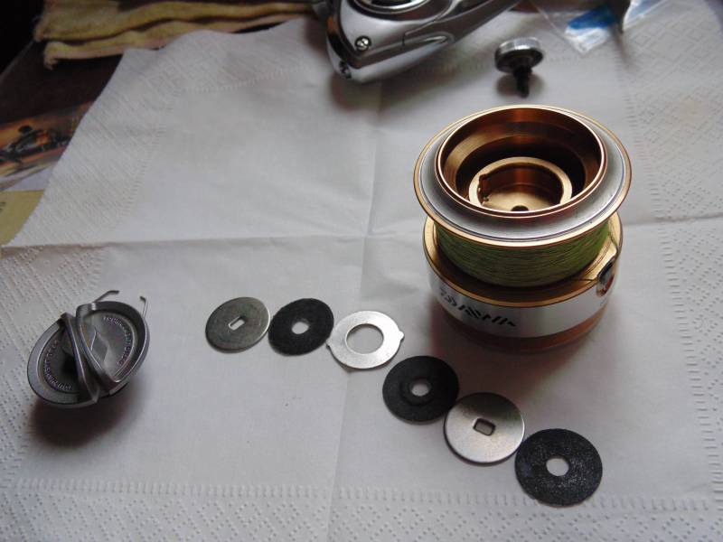 Шпуля из алюминиевого сплава + защитное покрытие. Пакет фрикциона состоит из шести маленьких дисков. Гайка фрикциона из пластика, не очень удобная.