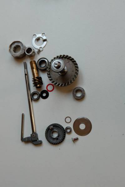 Подшпульный узел состоит из металлической основы(которая фиксируется на штоке с помощью металлической оси), трещётки, шайбы, металлической втулки, сверху втулка фиксируется пружиной. Металлическую втулку лучше заменить на подшипник закрытого типа размером 7*11*3.