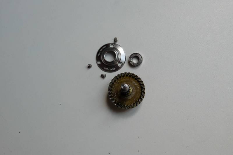 Снизу корпус защищает пластиковая крышка. Вот и добрались до самого главного. Крышка выполнена из алюминиевого сплава, крепится к корпусу с помощью четырёх саморезов(лишний раз лучше не разбирать). В металлической накладке спрятаны шайбы для регулировки главной пары, что еще очень удобно. Колесо увесистое, выполнено из качественного сплава + защитного покрытие. Справа и слева колесо опирается на два подшипника размером 7*13*4. Ведомая выполнена из бронзы, сверху опирается на антикоррозийный подшипник размером 7*14*5, снизу такого же типа подшипник 6*10*3 ,отрегулирован шайбой, также видим внизу пластиковый вкладыш. Паразитка мелкозубая, изготовлена из алюминиевого сплава, вращается на закрытом подшипнике размером 5*8*2,5, отрегулирован шайбой. Под паразиткой видим шайбу из нержавейки. Шток довольно тонкий, сделан из нержавейки. Сама кулиса из алюминиевого сплава. Направляющая также из нержавейки, отличного качества. Обгонная муфта от Koyo, работает стабильно.Препятсвует самосбросу резиновый сальник.