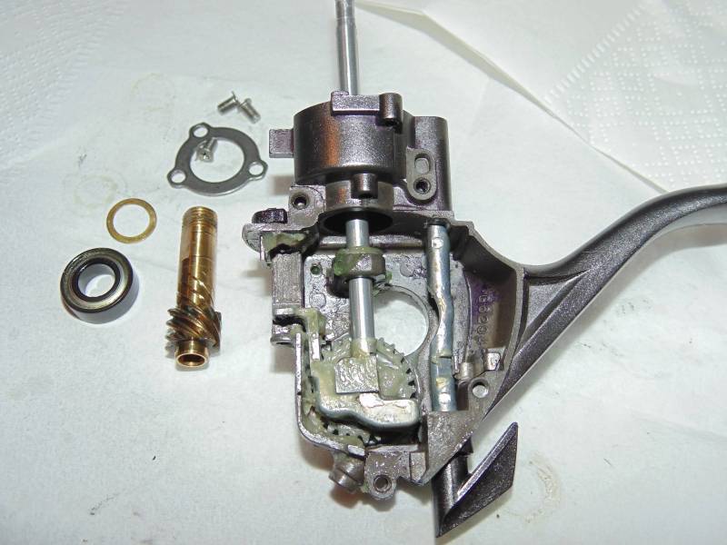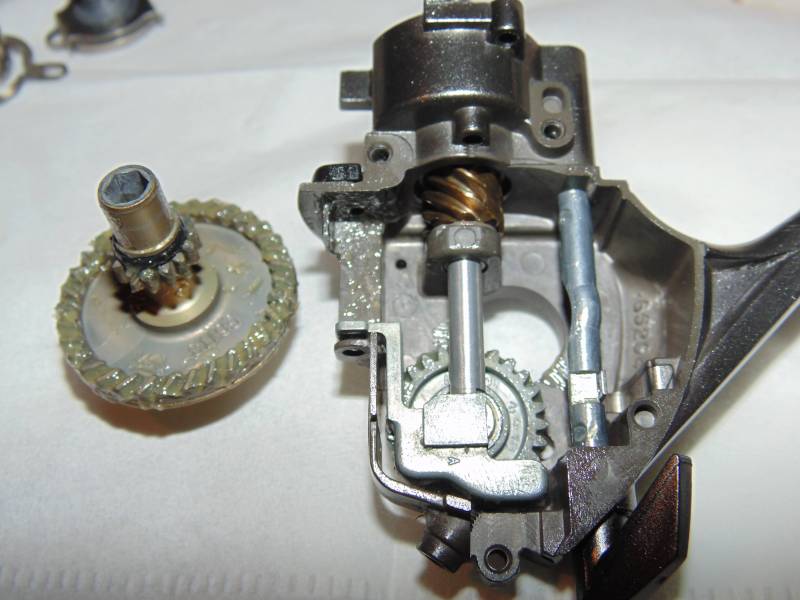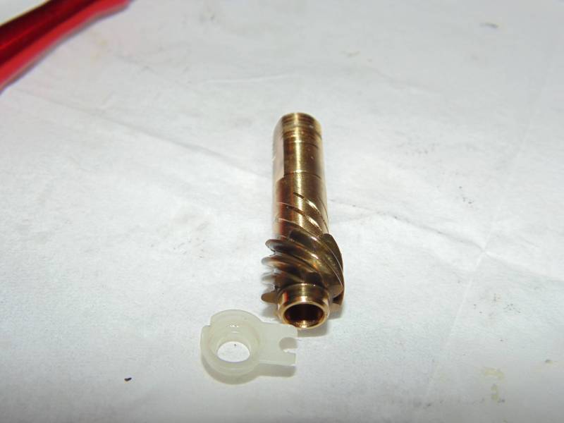 Достаём ведущую шестерню. Колесо выполнено из крепкого алюминиевого сплава, имеет качественное покрытие. Теперь откручиваем три винта и вынимаем подшипник с ведомой. Ведомая из бронзы, упирается во фторопластовую втулку. Втулка очень качественная. Сидит всё жёстко, плотно.