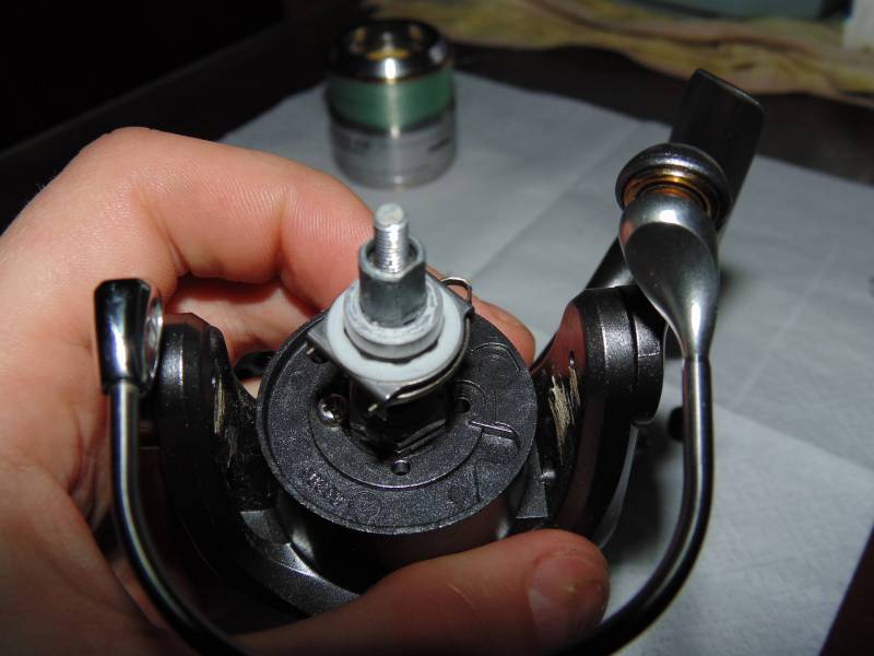 Механизм сброса классический. С одной стороны видим пружину с толкателем и пластикой втулочкой. Пружина очень качественная, долго не садится, на катушке шимано такого класса пружина садится гораздо быстрее.