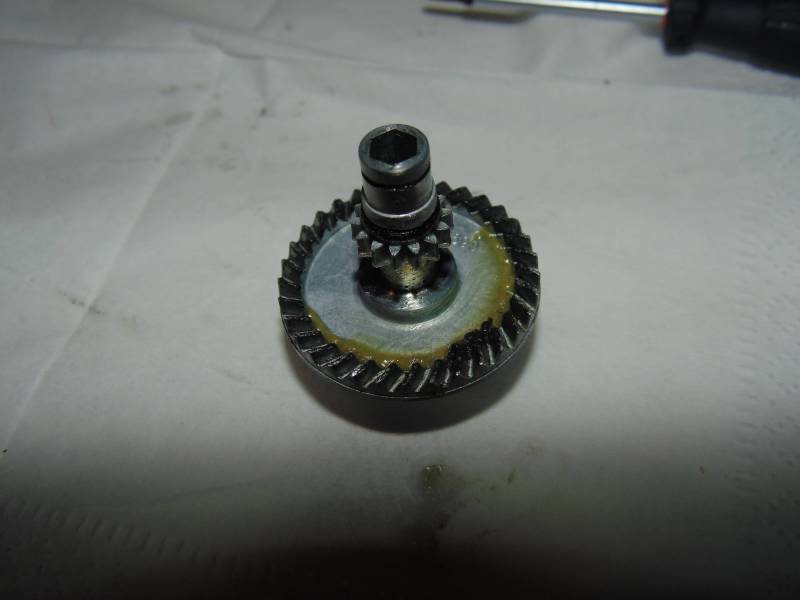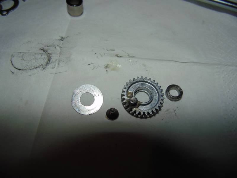 Ведущее колесо из цинко-алюминиевого сплава, по качеству примерно такое как на кальдии. Слева опирается на подшипник размером 7*13*4, справа непонятно зачем на 7*11*3. Ведомая из бронзы, опирается сверху на закрытый подшипник размером 7*14*5, снизу же упирается в корпус, но это нестрашно, так как заходит глубоко в корпус.