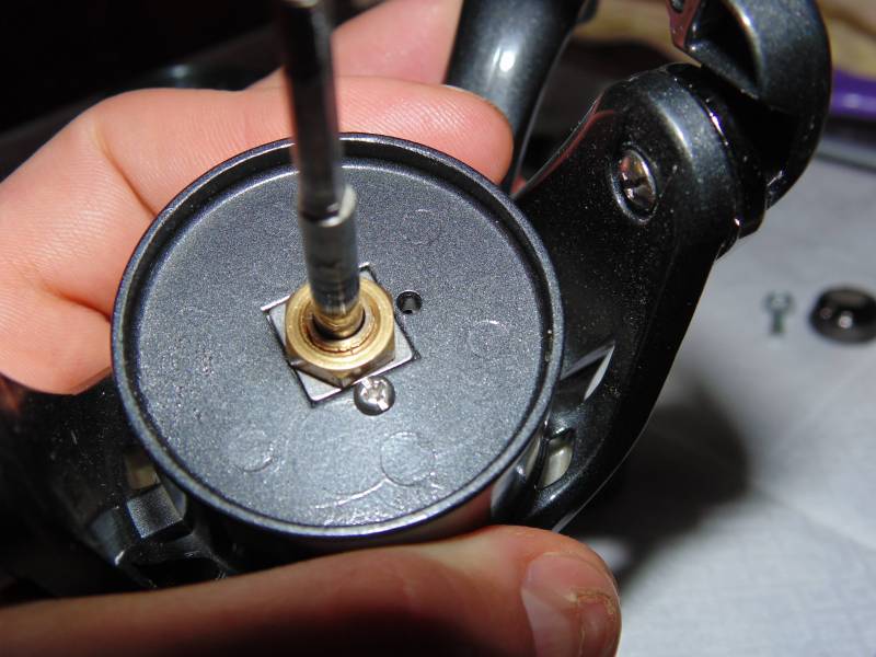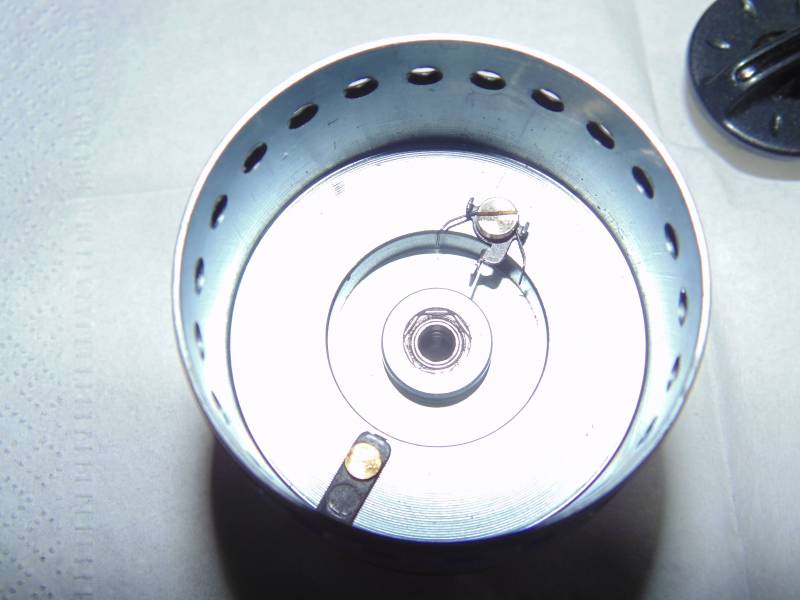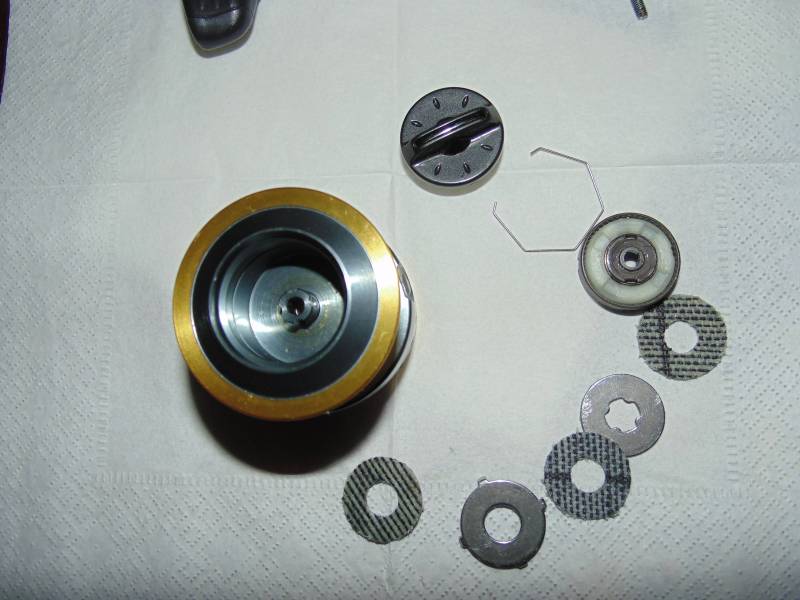 Пакет фрикциона состоит из трёх войлочных, двух металических + верхняя трещетка. Гайка фрикцона выполнена из пластика. С обратной стороны шпули видим трещётку и подшипник размером 4*7*2,5, непонятно конечно зачем они поставили такой маленький подшипник.