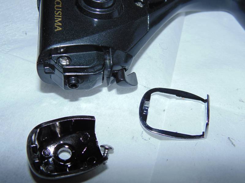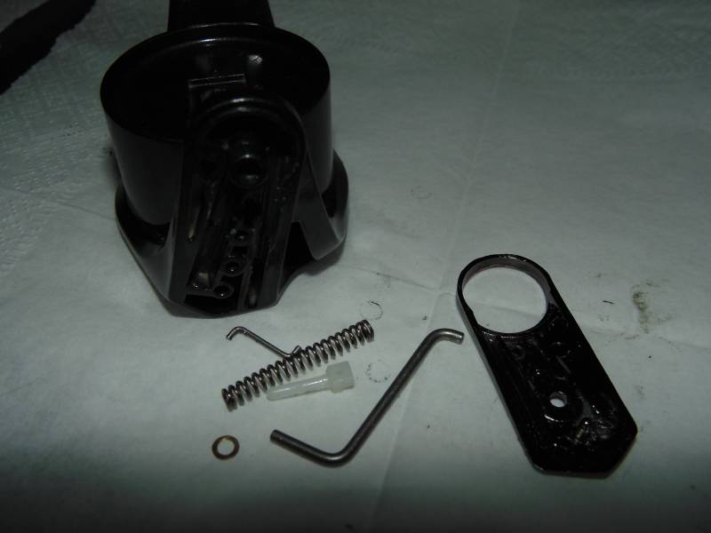 Узел довольно удачный. Два толкателя, пружина и пластиковая вставка. Откручиваем саморезы на корпусе и можем добраться до внутренностей.