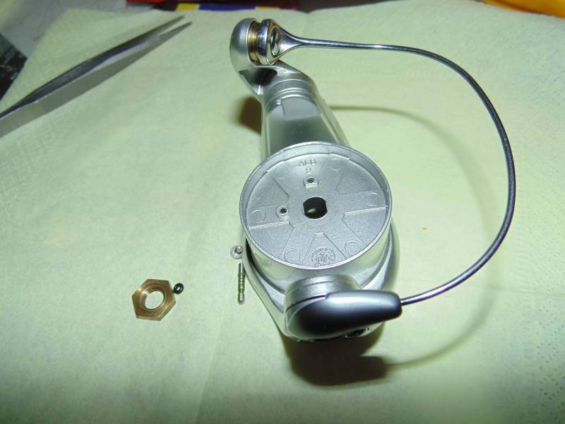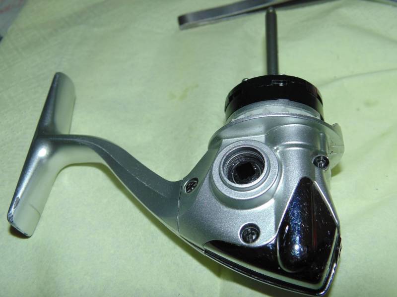 Сняв шпулю видим штырёк,который фиксируется резиновым сальником(не самое лучшее решение но всё же).Гайка бронзовая, присутствует стопорный винтик.