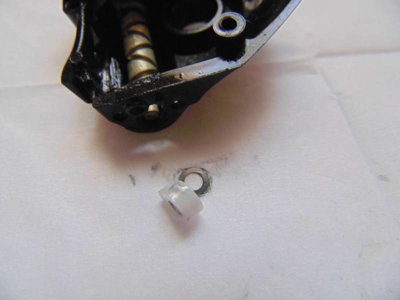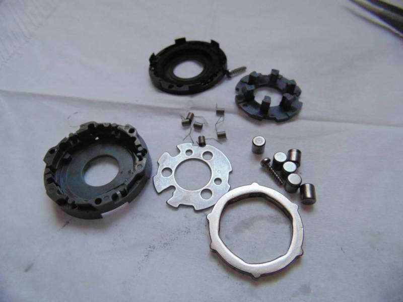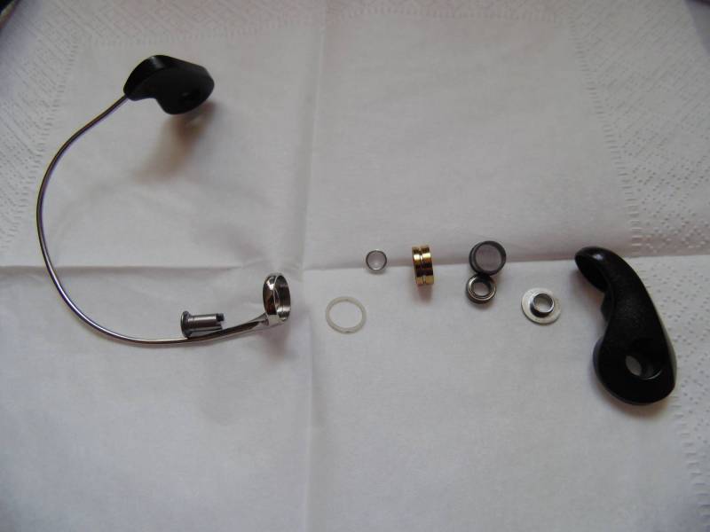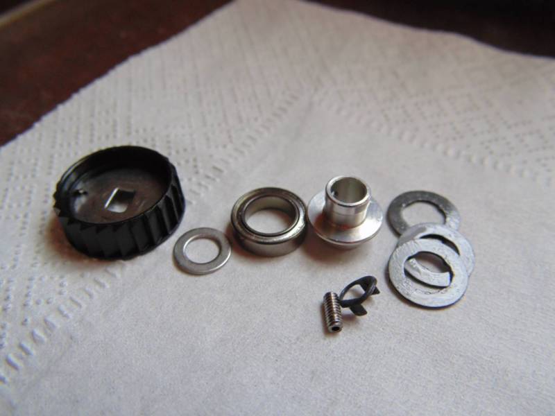 Подшпульный узел состоит из колесика(внутри которого шайбочка прикрепленная проволочной пружинкой. Если Вы собрались разбирать, то будьте внимательны, потому как она любит смещаться, тогда не будет трещетка работать) ,шайбочки ,подшипник , метал основы(под ней садится подшипник ),шестигранного винтика, которым фиксируется основа на штоке ,маленькой пластикой втулочки и конечно же регулировочных шайб от которых зависит профиль намотки.