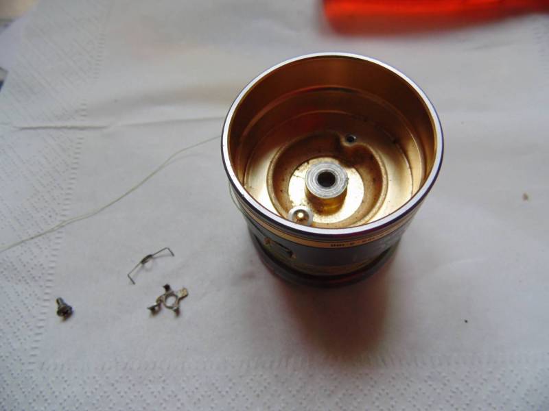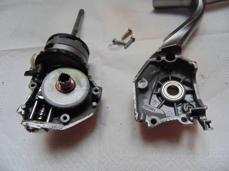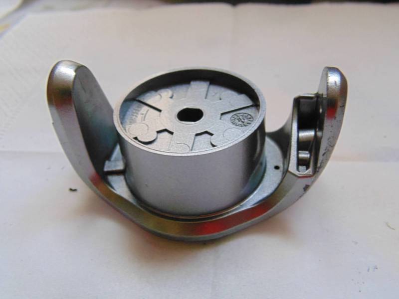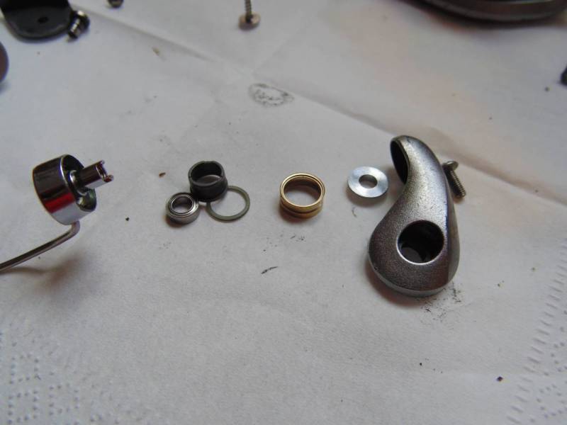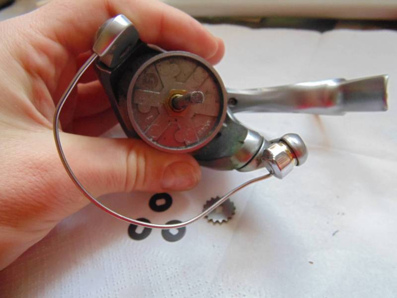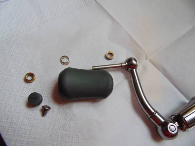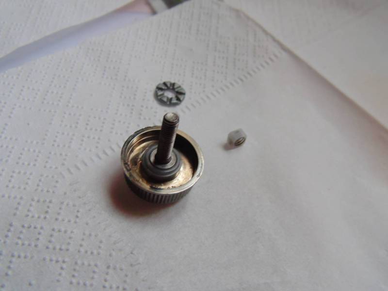 Ручка довольно удобная,из алюминиевого сплава.Ручка не вкручивается,но сидит довольно надёжно,благодаря зубьям, которые находятся на ручке и на валу.С обратной стороны закручиватся заглушка-винт,также видим алюминиевую шайбу(иногда трескает).Кноб сделан из резины и вращается на двух бронзовых втулках,конечно лучше заменить на подшипники, но и так работает очень долго.