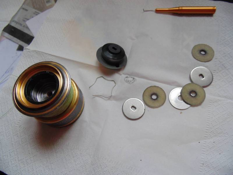 Шпуля из алюминиевого сплава,повсюду видим защитое анодирование.Но получилась довольно тяжёлой. Конечно можна немного облегчить. Пакет фрикциона состоит из трёх войлочных и трёх металлических дисков.