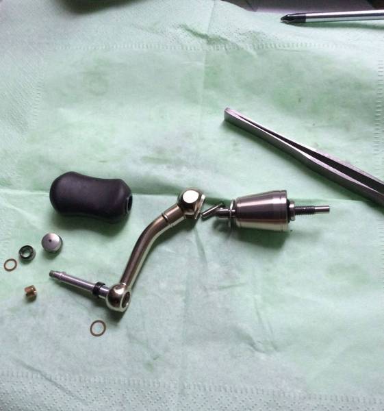 Ручка вполне обычная из алюминиевого сплава. Кноб тоже стандратный,резиновый вращается на двух открытых подшипниках,один из которых несъёмный,всё хорошо отрегулировано.