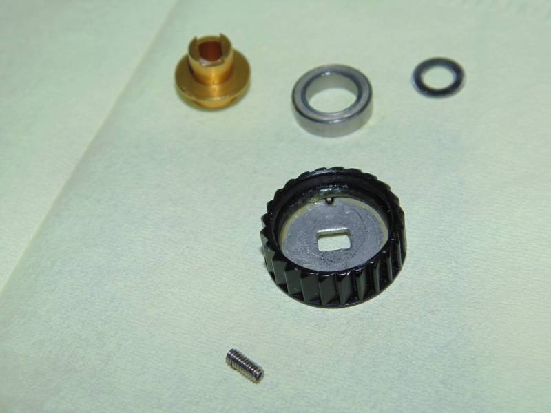 Ведомая шестерня из бронзы . Снизу и сверху опирается на подшипники.Имеется резиновое колечко внизу ведомой шестерни,оно способствует более тихой и корректной работе