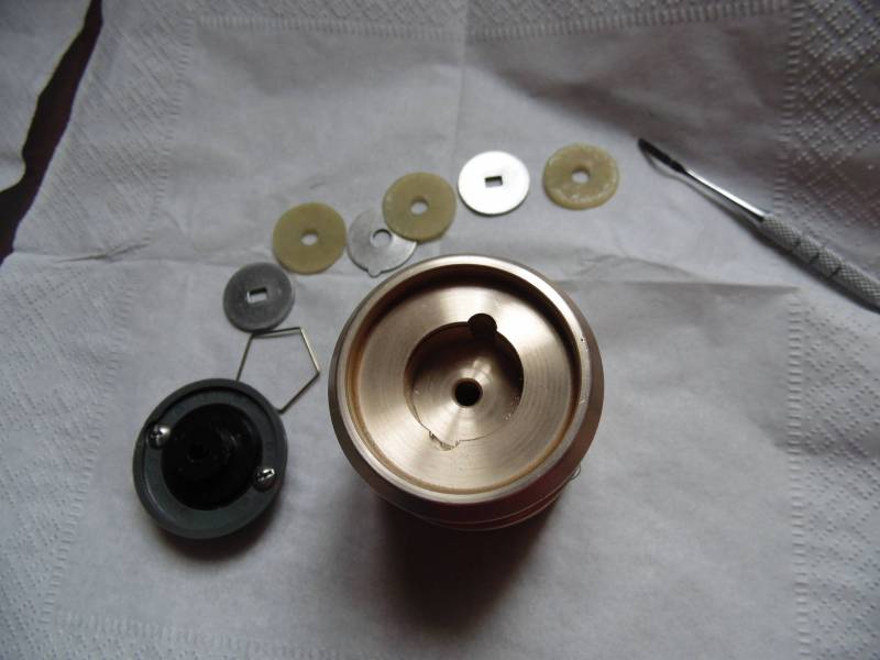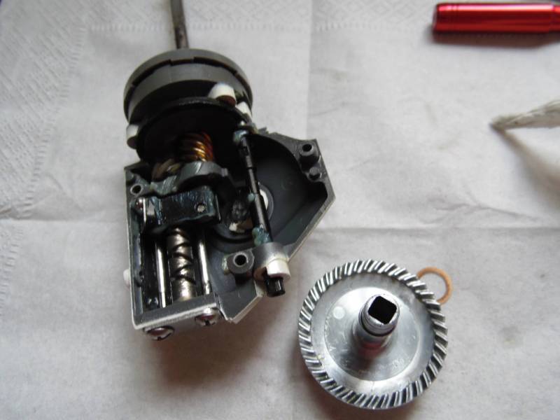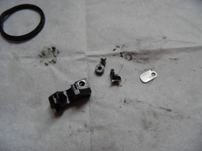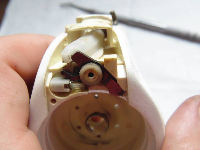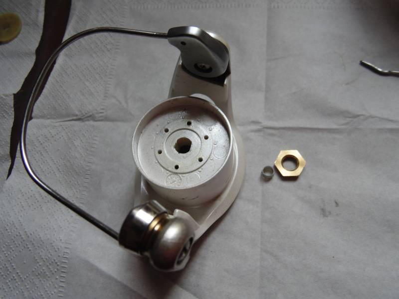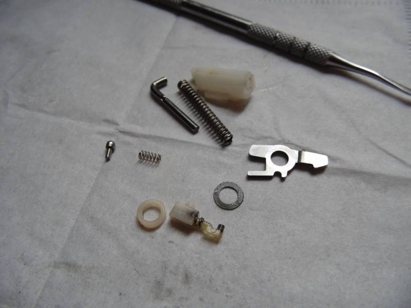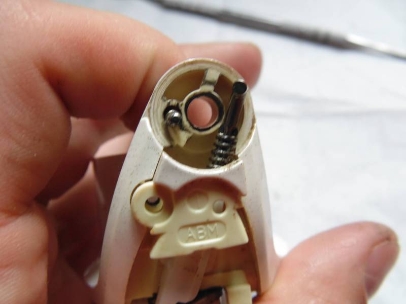 Состоит из толстой пружины c толкателем,металлического фиксатора дужки с пружинкой.Вместо обычного рычага видим такую вот систему.Я нахожу ее получше.