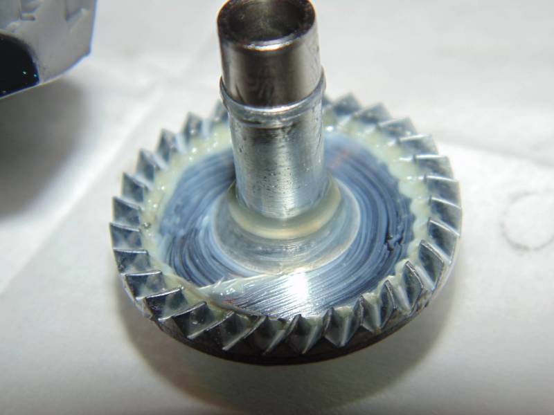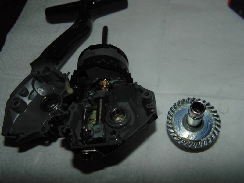 Теперь можна добраться до механизма.Как правило главная пара нормально отрегулирована.Ведущая сделана из алюминиевого сплава,слабовата,поэтому нагружать её не стоит