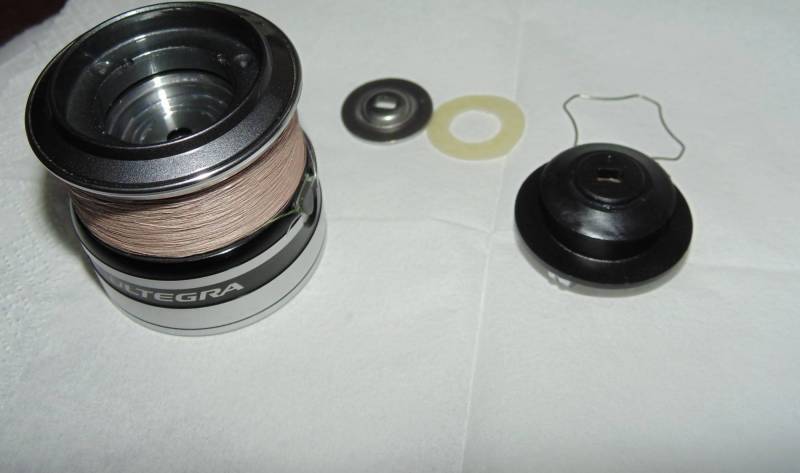 Шпуля из алюминиевого сплава,довольно легкая.И ничего страшного ,что нету нитрид титана на бортике.Облегчать её не стоит.Пакет фрикциона состоит из двух дисков.Фрикцион довольно жёсткий,особенно ощутимо на крупной рыбе.Но можна сделать помягче!) Гайка фрикциона довольно удобная.Видим намотка достойная,с тонкими шнурами тоже справляется неплохо.