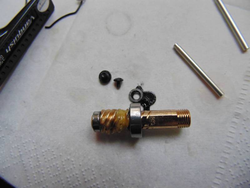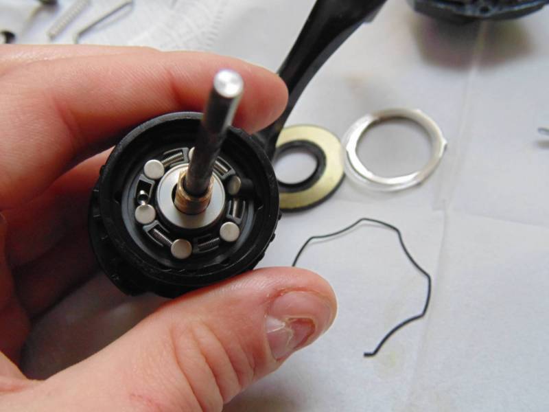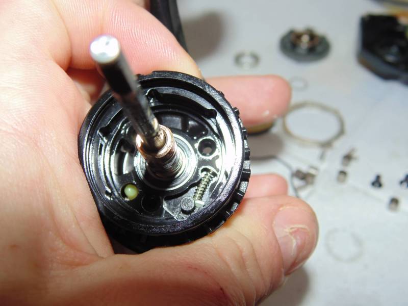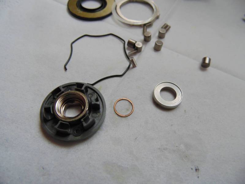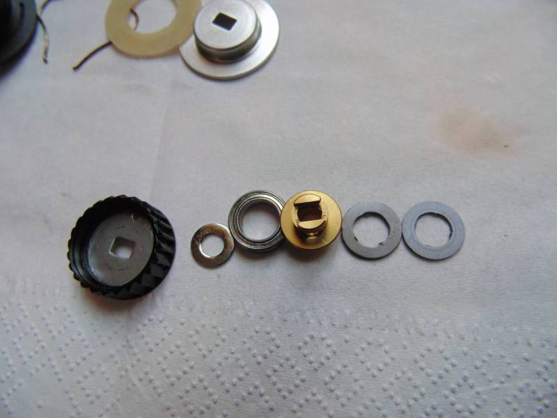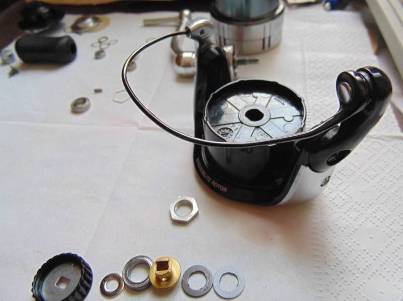 Подшпульный узел стандартный.Состоит из колесика(внутри которого шайбочка прикрепленная проволочной пружинкой. Если Вы собрались разбирать, то будьте внимательны, потому как она любит смещаться, тогда не будет трещетка работать) ,шайбочки ,подшипника, метал основы(под ней садится подшипник ),шестигранного винтика, которым фиксируется основа на штоке и конечно же регулировочных шайб от которых зависит профиль намотки.