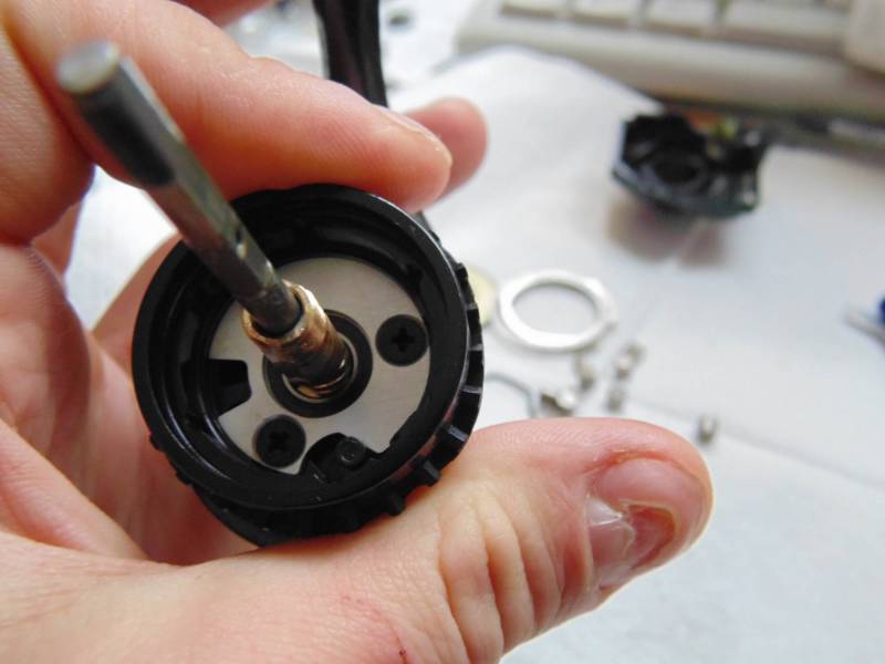 Что бы увидеть третий винт, надо снять декоративную крышечку .Cправа видим резиновую втулку, теперь нужна длинная крестообразная отвертка. Откручиваем, теперь крышка снимается. Наконец показался третий маленький винтик. Все теперь можна снять крышку.