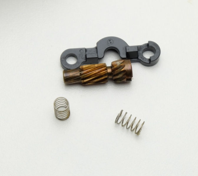 Ведомая шестерня сделана из такого же сплава что и колесо. Устанавливается в пластиковую основу на которой две маленькие пружинки.Опирается внизу на подшипник из нержавейки 8*12*3,5.