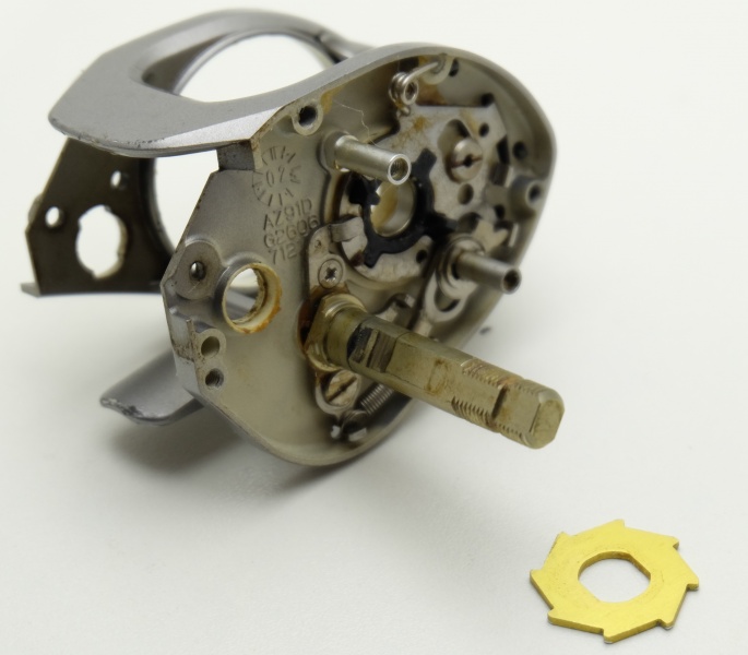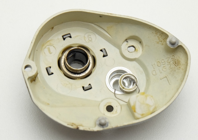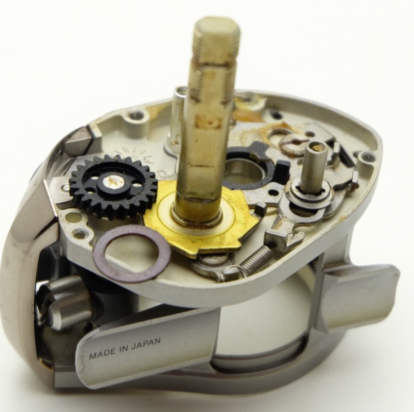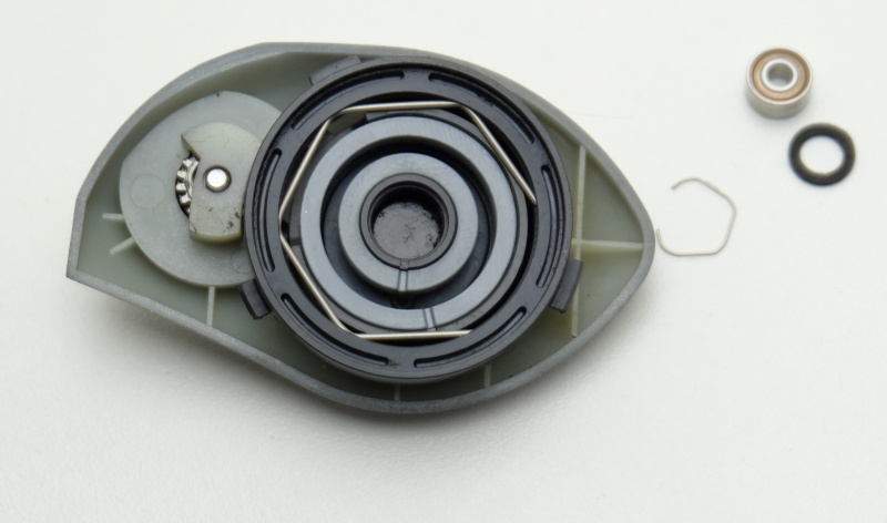 Вал лёгкий с алюминиевого сплава, с защитным покрытием.Закреплен с помощь металлической пластинки на двух винтах и опирается на подшипник размером 5*8*2,5. Просто отличнейшая и надёжная система включения/выключения клавиши. Очень качественные пружины, металлические вставки, сидит всё плотно и надёжно. Клавиша из пластика с покрытием из никеля. Работает всё отлично. Корпус как и крышка сделан из магниевого сплава. Очень точно сделан кстати. Лакокрасочное как и на крышке, так себе.