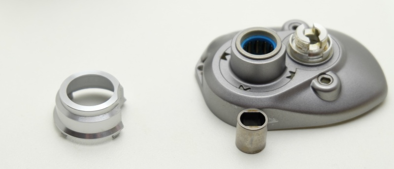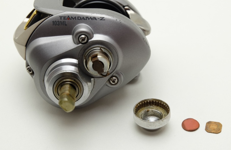 А вот и боковая крышка с магнитной системой. Крышка выполнена из крепкого пластика. Магнитная система торможения очень удачная, крайне редко проблемы с магнитами. Регулировка с помощью колёсика с трещёткой. Одна из самых лучших и простых систем торможения за всю историю. Вторый шпульный также из нержавейки размер 3*8*4.