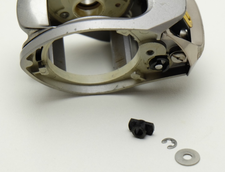 Теперь снимаем с обратной стороны скобку и снимку пластиковую втулку на которую опирается бесконечник.