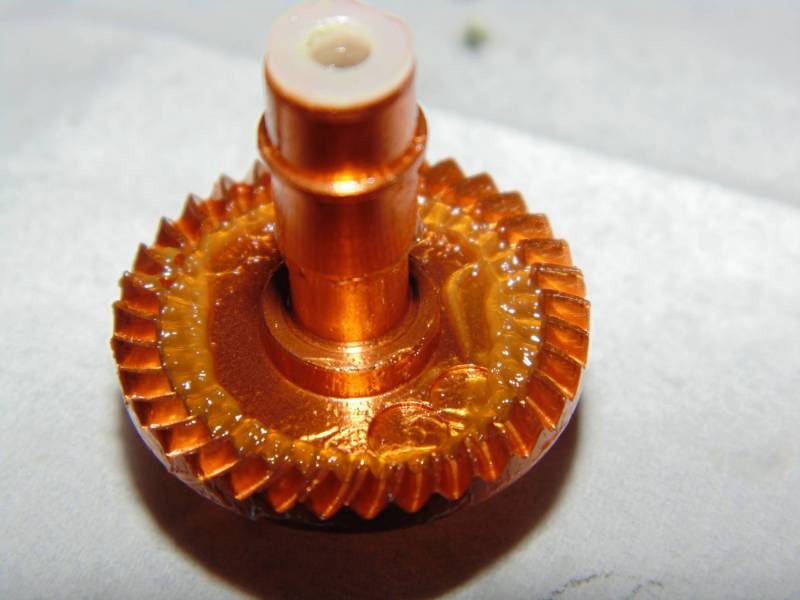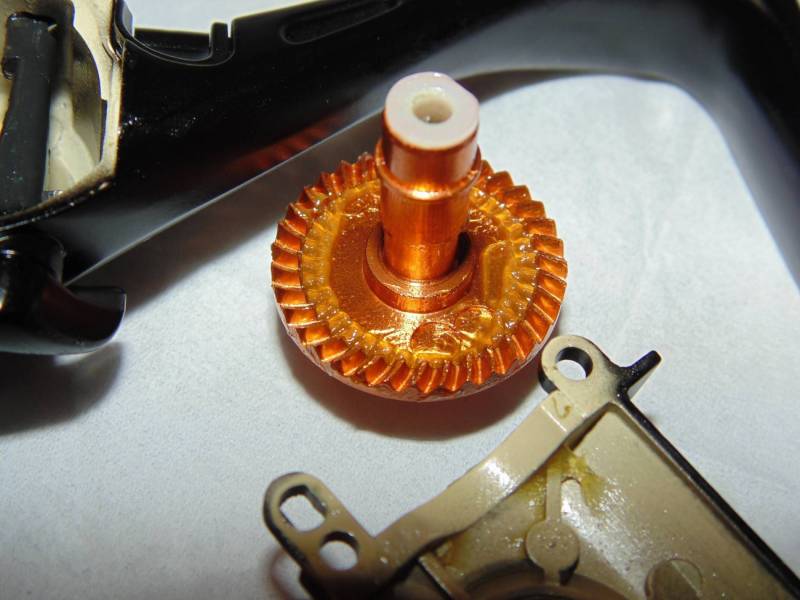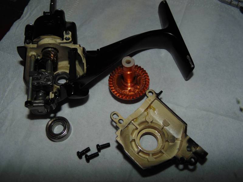 Чтобы достать ведомую шестерню и обгонку надо открутить три винта.Дальше наблюдаем следущую картину:металлическая штуковина,в которой сидит большой подшипник,металлическую шайбу,две металлические шайбы,сама обгонка втулку обгонки подшипник ,металлическую шайбу, бронзовую ведомую шестерню и большую металлическую втулку, в которую всё садится .Конструкция вроде хорошая,да и с обгонкой проблем поменьше, чем в более новых моделях,но есть одно весомое ‘’НО’’-ведомая то не упирается никуда,а по сути висит в воздухе,когда собираешь надо ещё аккуратно одевать ротор чтобы затянуть гайку,ведомая падает вниз.Это есть большой минус.