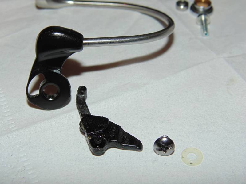 Каретка состоит из пластиковой втулки, шайбы и бегунка. Опирается на одну алюминиевую направляющую. Бегунок(водило) нормально не фиксируется (видим вилку которая на него ложится).Стоило сделать отдельную пластинку, как это сделано в Shimano или в том же Заубере.