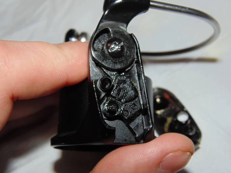 С другой стороны видим механизм из двух пластиковых пластин.Верхняя вставляется в рог дужки,при открытии дужки механизм приводится в действие.Всё просто и надёжно,безо всяких пружинок и т.д..На корпусе имеется ролик, в который упирается пластиковая пластина.Система удачная и долговечная.